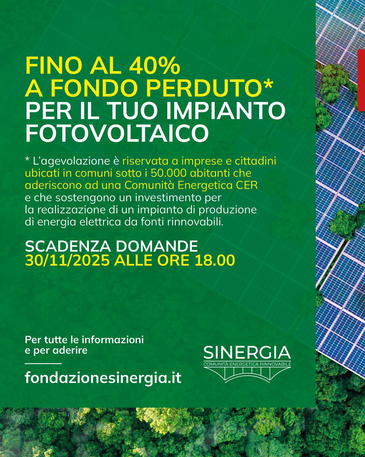 al fine di promuovere l’adesione CER Fondazione Sinergia mette a conoscenza i suoi cittadini circa la possibilità di ricevere il contributo PNRR del 40% a fondo perduto per l’istallazione di un impianto fotovoltaico.