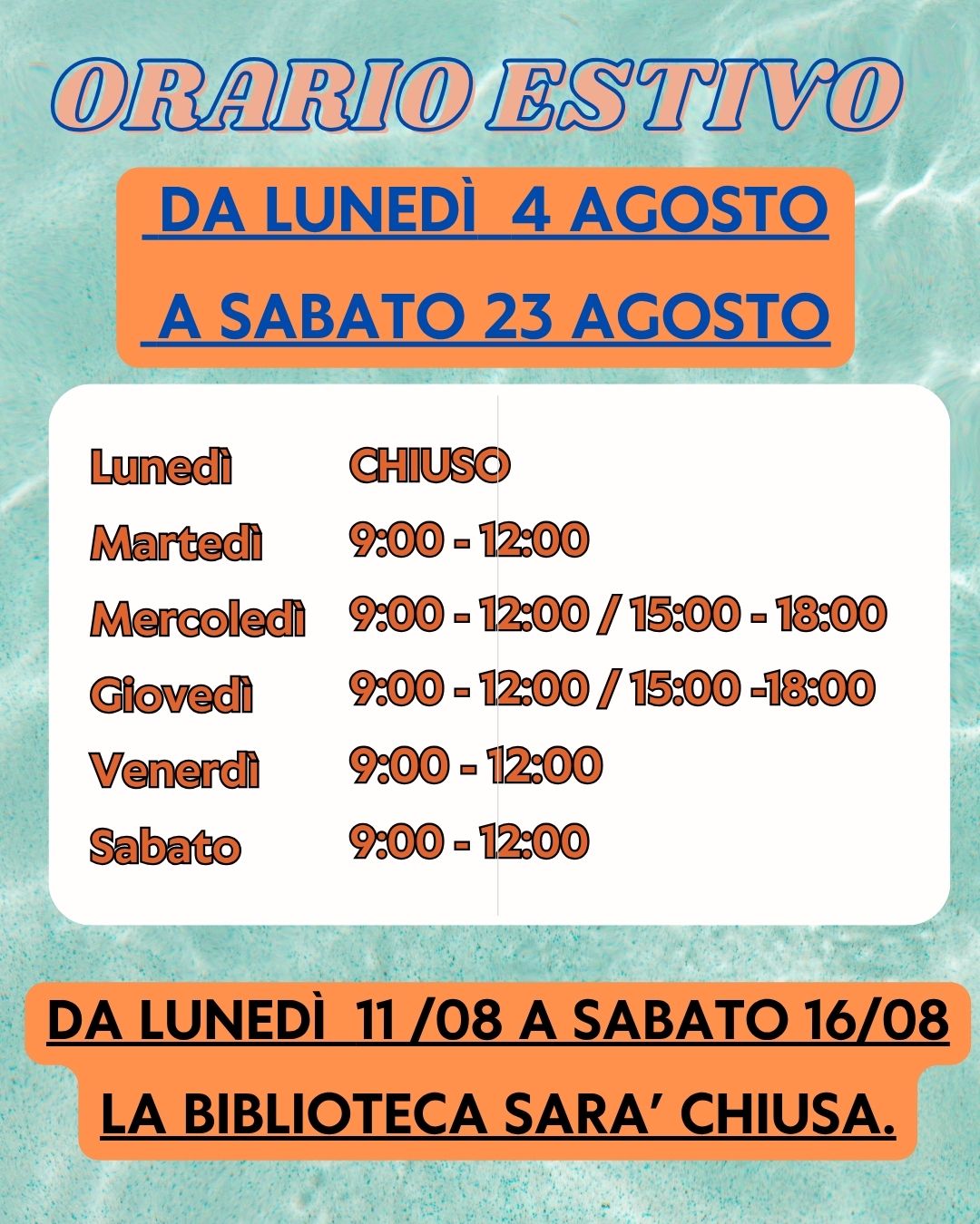Da lunedì 4 agosto a sabato 23 agosto i nuovi orari di apertura sono: