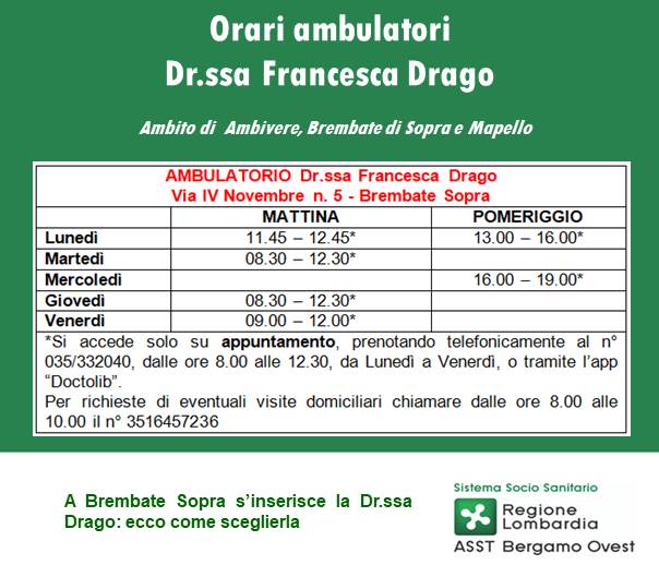Lunedi 09 settembre 2024 s’inserirà, nell’ambito di Ambivere, Brembate di Sopra e Mapello quale Medico di Assistenza Primaria Titolare, la Dr.ssa Francesca Drago.