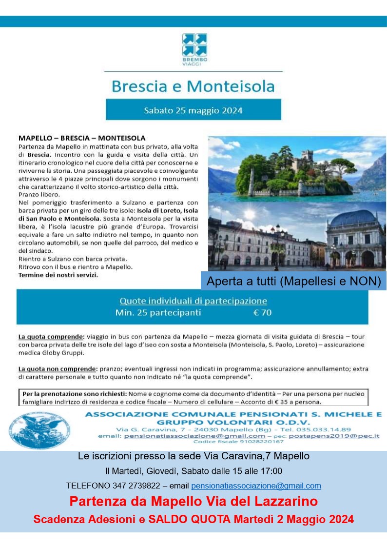 gita sabato 25 maggio organizzata da Associazione Pensionati S.Michele