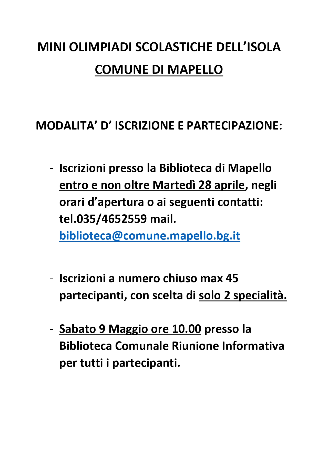 Iscrizione obbligatoria in biblioteca entro il 28 aprile, numero chiuso max 45 partecipanti con adesione a massimo due specialità!