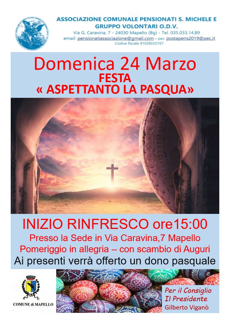 Domenica 24 marzo 2024 Festa "Aspettando la Pasqua"presso sede Associazione Pensionati S.Michele, Via Caravina 7 Locandina (jpg - 217 KB)