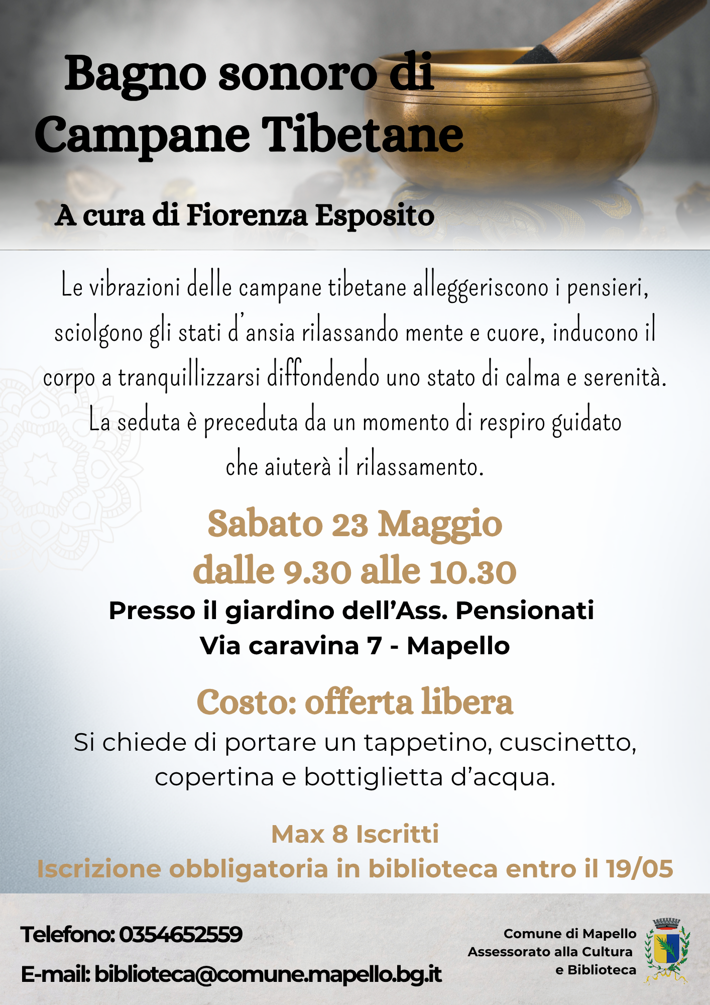 Costo: offerta libera. Si chiede di portare un tappetino, cuscinetto, copertina e bottiglietta d’acqua.