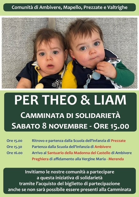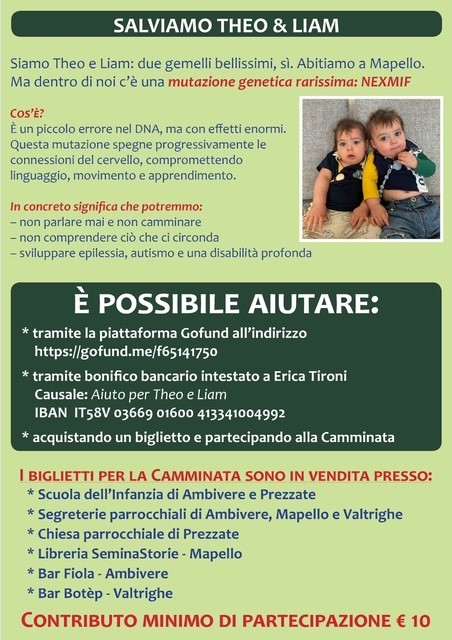 Le comunità di Ambivere, Mapello, Prezzate e Valtrighe organizzano una camminata al fine di raccogliere fondi per sostenere le cure necessarie per i due gemelli di Mapello affetti dalla rara malattia genetica Nexmif