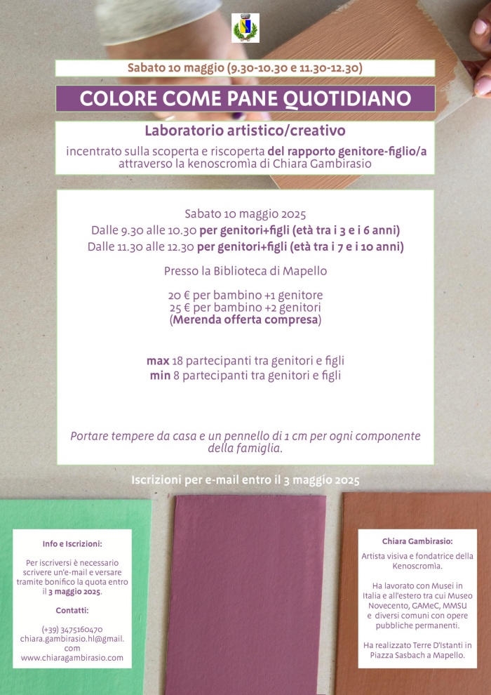 Laboratorio artistico incentrato sulla scoperta e riscoperta del rapporto genitore/figlio attraverso la kenoscromia sabato 10 maggio dalle ore 9.30 alle ore12.30
