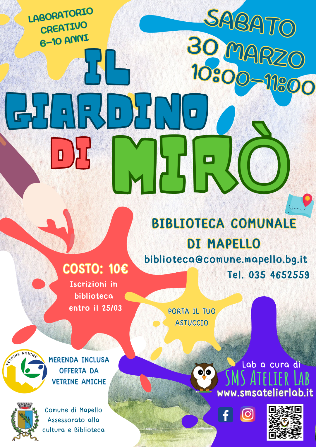 Il Giardino di Mirò Sabato 30 marzo dalle 10.00 alle 11.00 per bambini dai 6 ai 10 anni, a cura di SMS ATELIER LAB. Nel volantino allegato tutte le info e le modalità d'adesione!