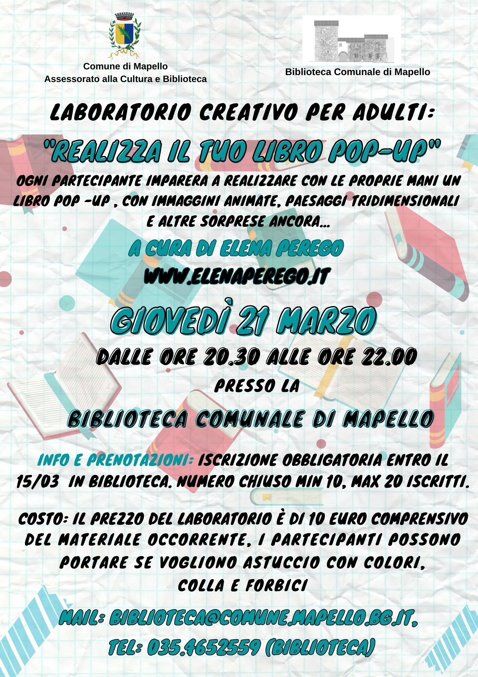 Laboratorio creativo per Adulti a cura di Elena Perego Giovedì 21 Marzo dalle ore 20.30 fino alle 22.00 Iscrizioni in biblioteca, nel volantino allegato tutte le info!