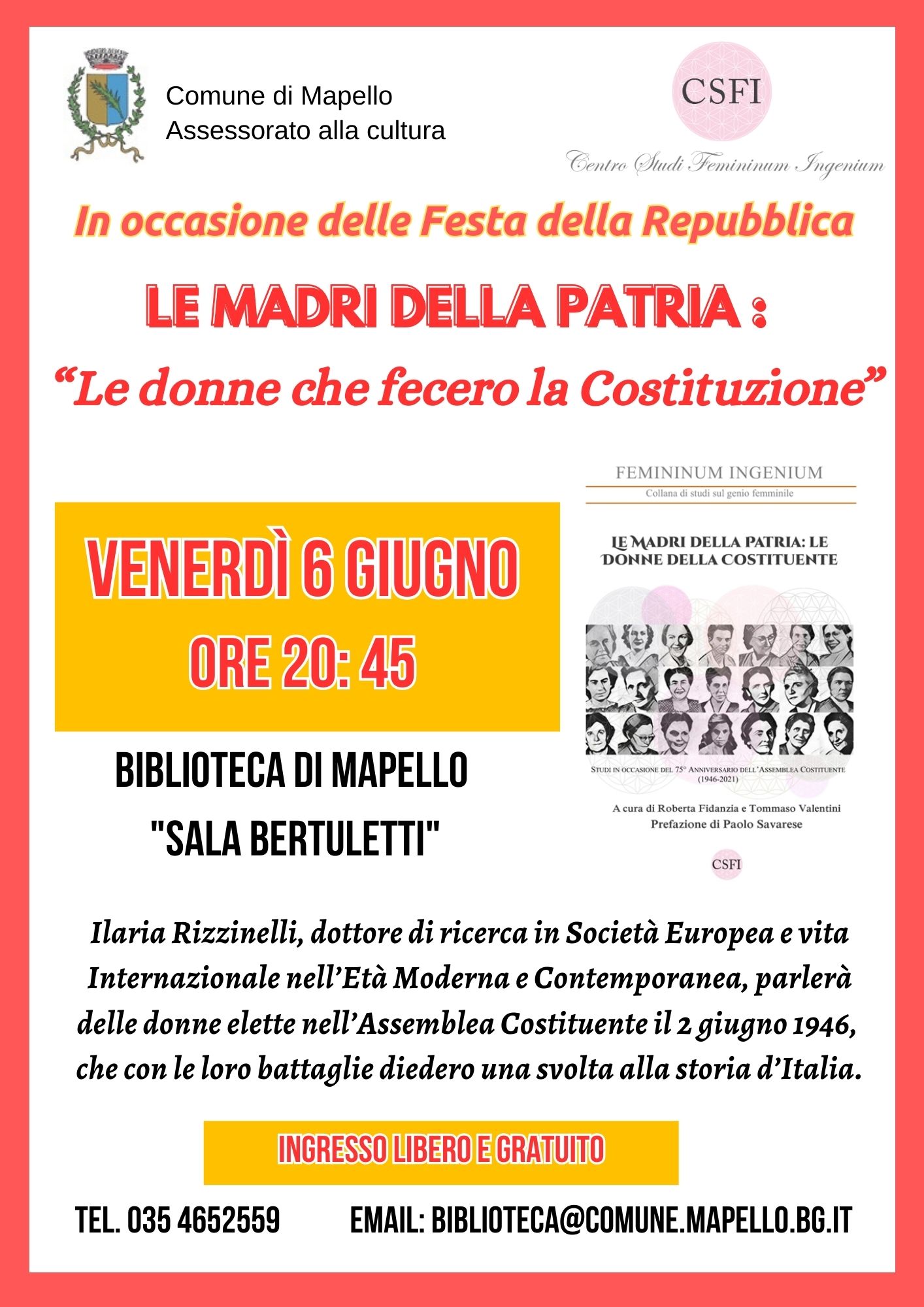 In occasione della Festa della Repubblica il Comune di Mapello- Assessorato alla Cultura unitamente al Centro Studi Femininun Ingenium, ha organizzato un incontro con Ilaria Rizzinelli, dottore di ricerca in "Società Europea e vita internazionale nell'età moderna e contemporanea", che parlerà delle donne elette nell'Assemblea Costituente il 2 giugno 1946, che con le loro battaglie diedero una svolta alla storia d'Italia.