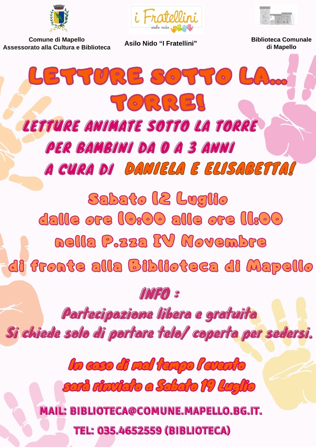 Letture sotto la.. Torre per bambini da 0 a 3 anni! Sabato 6 Luglio dalle ore 9.30 alle ore 10.30 per bambini da 0 a 3 anni. Nel volantino allegato tutte le info!