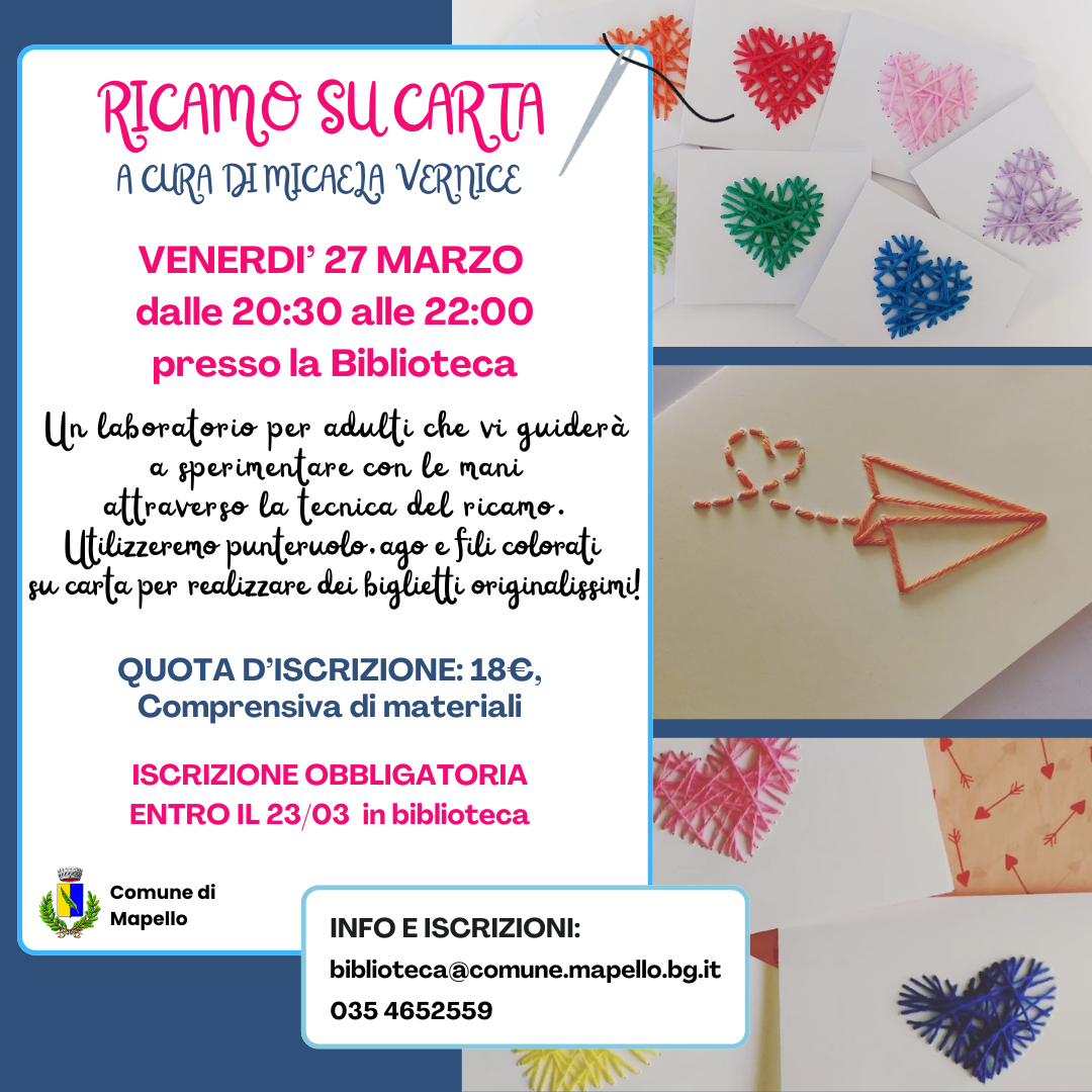 Un laboratorio per adulti che vi guiderà a sperimentare con le mani attraverso la tecnica del ricamo. Utilizzeremo punteruolo, ago e fili colorati su carta per realizzare dei biglietti originalissimi!
