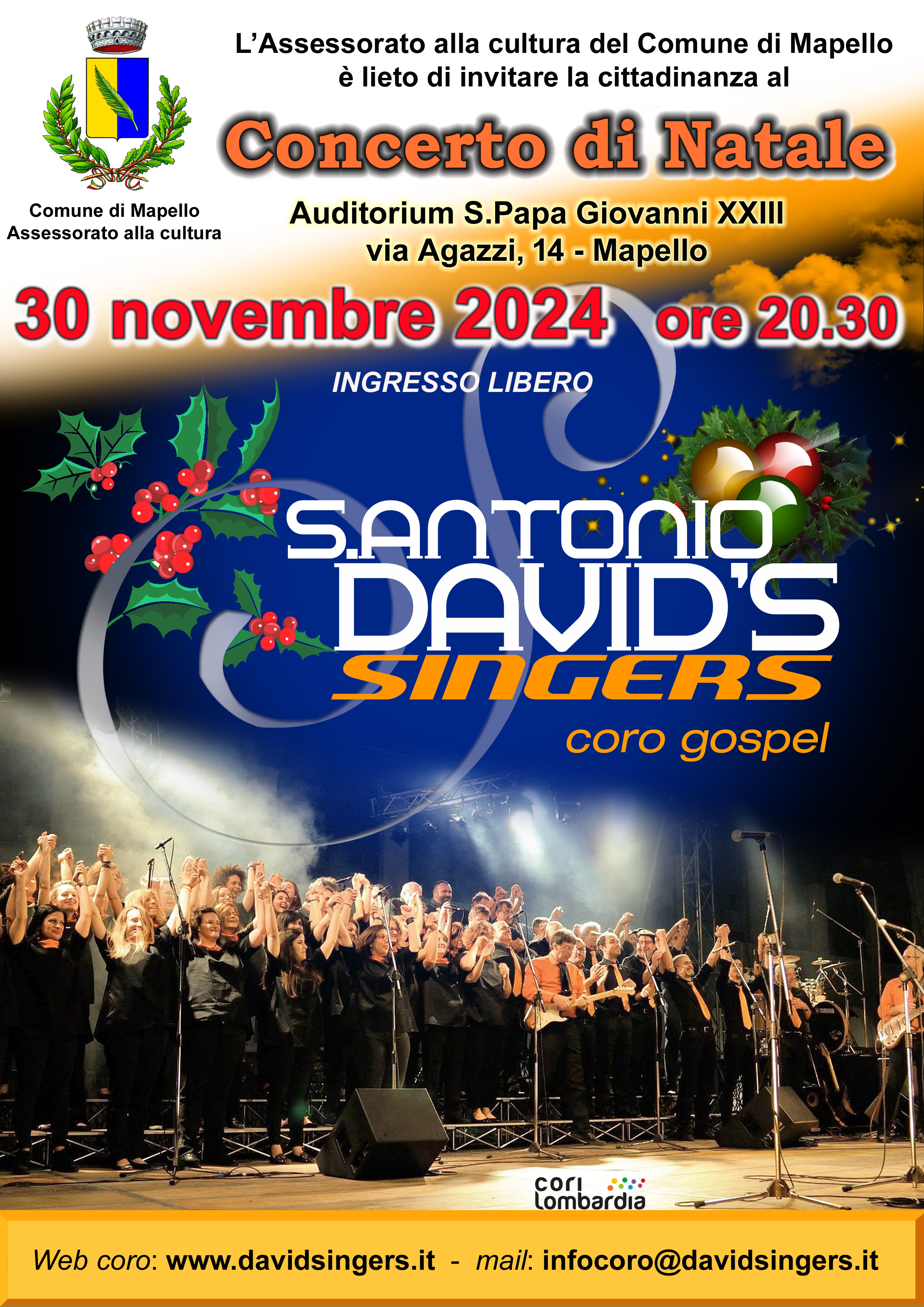 Concerto di Natale: S.Antonio David's Singers Sabato 30 Novembre ore 20.30 presso Auditorium Papa Giovanni XIII, via Agazzi 14-Mapello. Nel volantino allegato tutte le info!