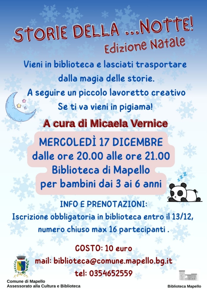 Mercoledì 17 dicembre dalle 20.00 alle 21. 00 presso la biblioteca di Mapello per bambini dai 3 ai 6 anni.