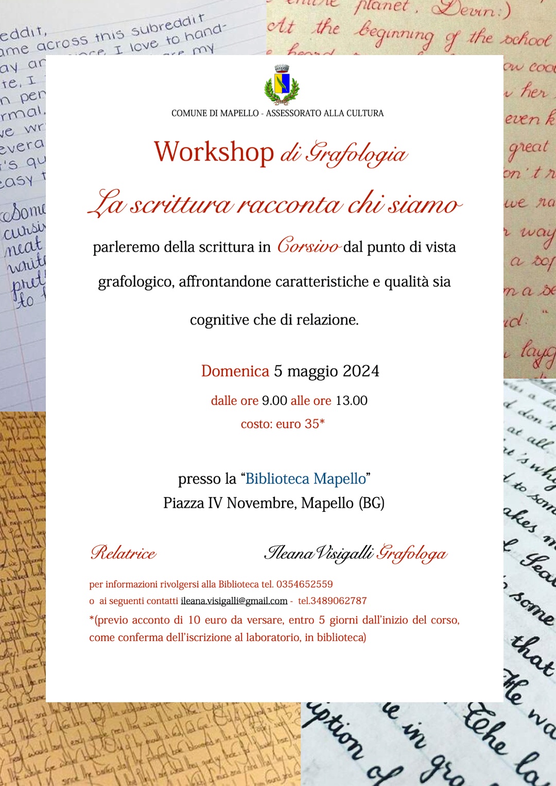 Workshop di Grafologia: La scrittura racconta chi siamo... Domenica 5 Maggio dalle 9.00 alle 13.00, a cura di Ileana Visigalli. Nel volantino allegato tutte le info e le modalità d'adesione.